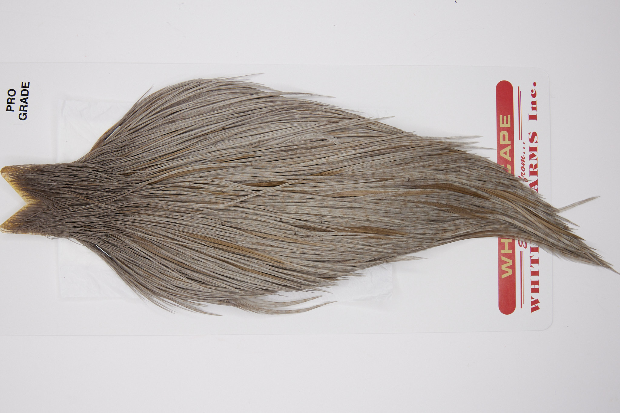 12323Whiting Pro Grade Rooster Cape of Medium Dun color that ties predominately size 8-20. The image shown is an actual photo of this dry fly cape. This is NEW UNUSED HACKLE.