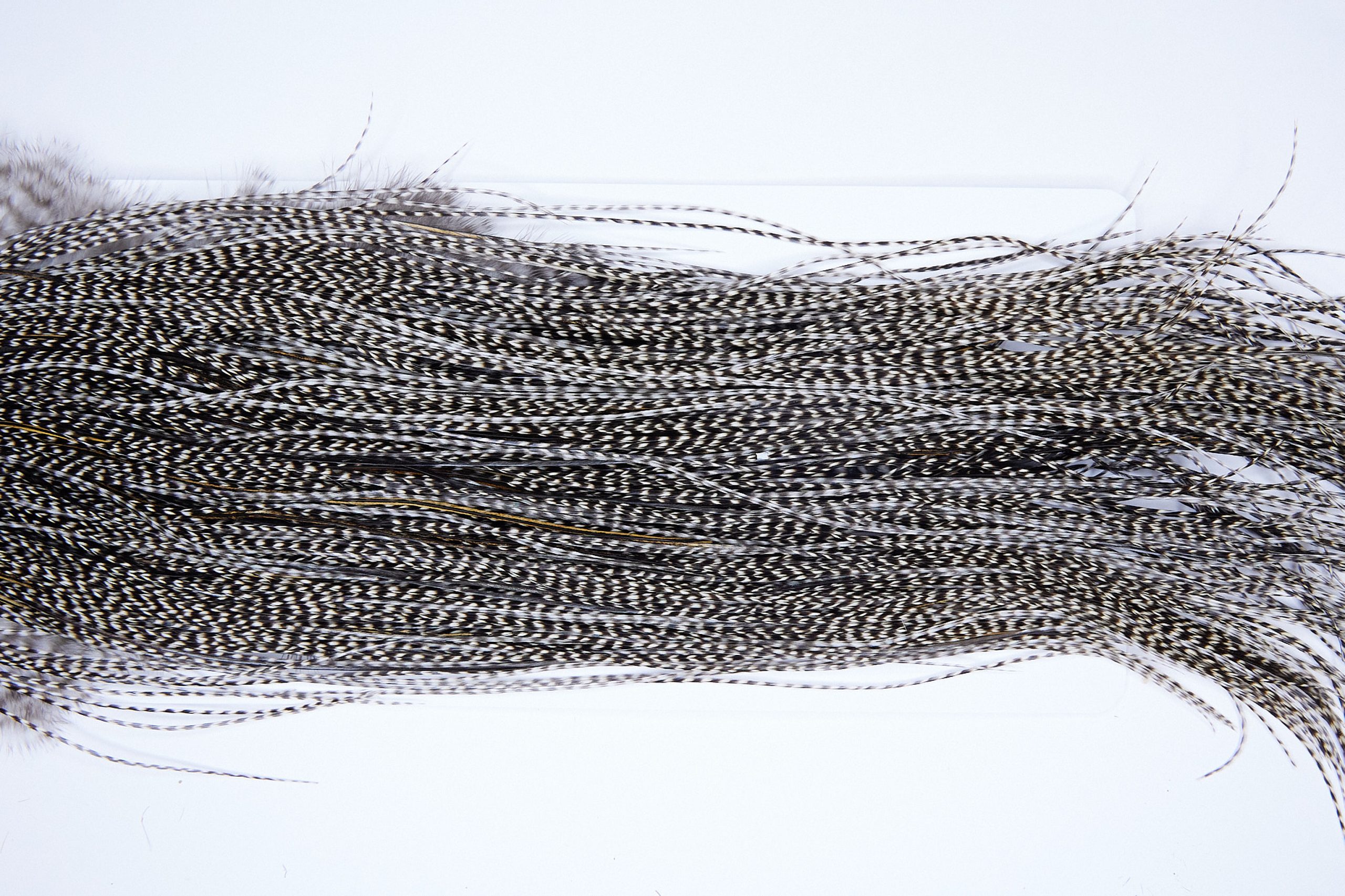 2106 is a Yellowstone Rhodium Rooster Saddle of Grizzly Variant color that ties predominately size 18-20. The image shown is an actual photo of this dry fly saddle. This is NEW UNUSED HACKLE.