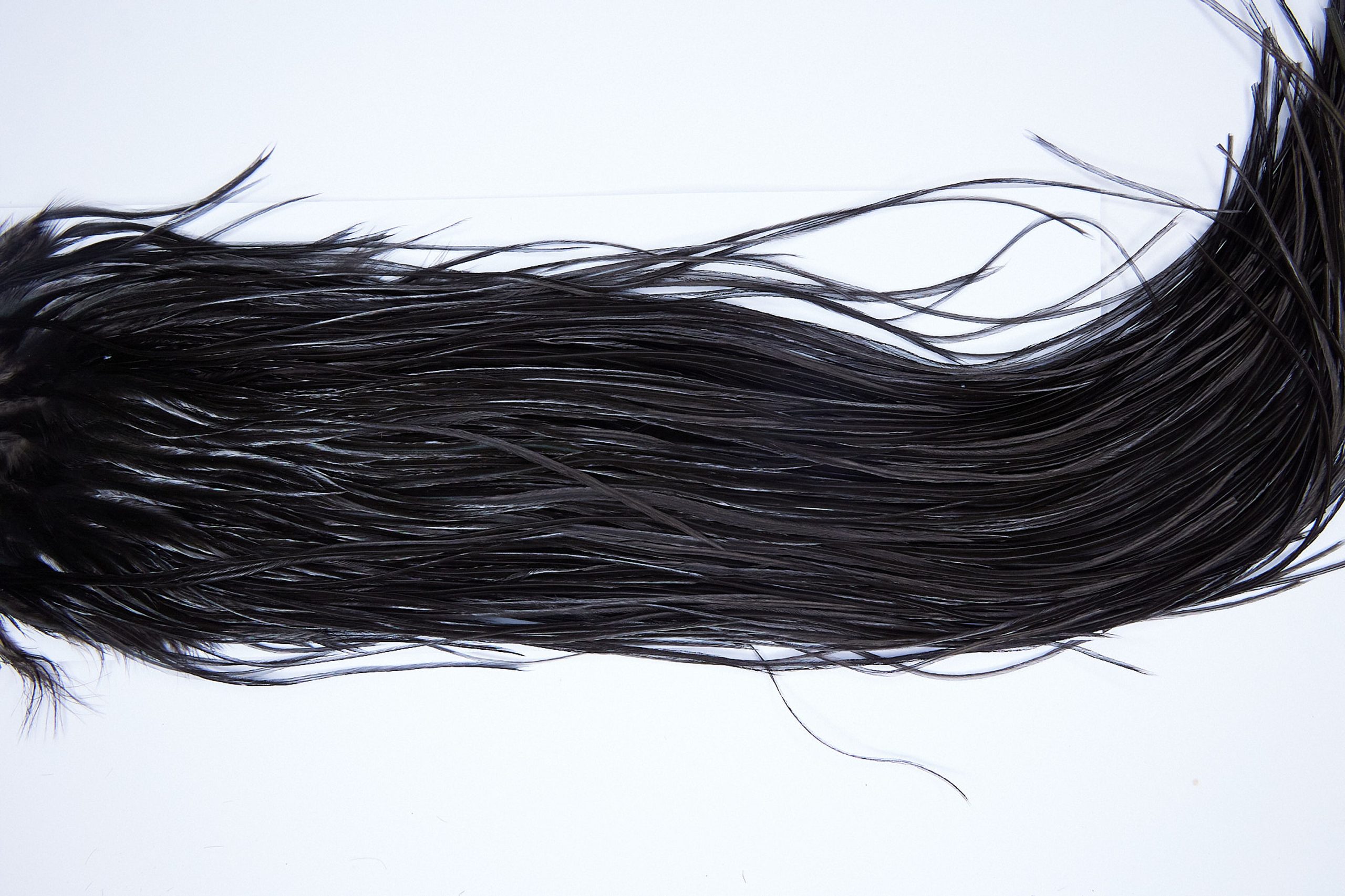 2116 is a Yellowstone Rhodium Rooster Saddle of Black color that ties predominately size 12-14. The image shown is an actual photo of this dry fly saddle. This is NEW UNUSED HACKLE.