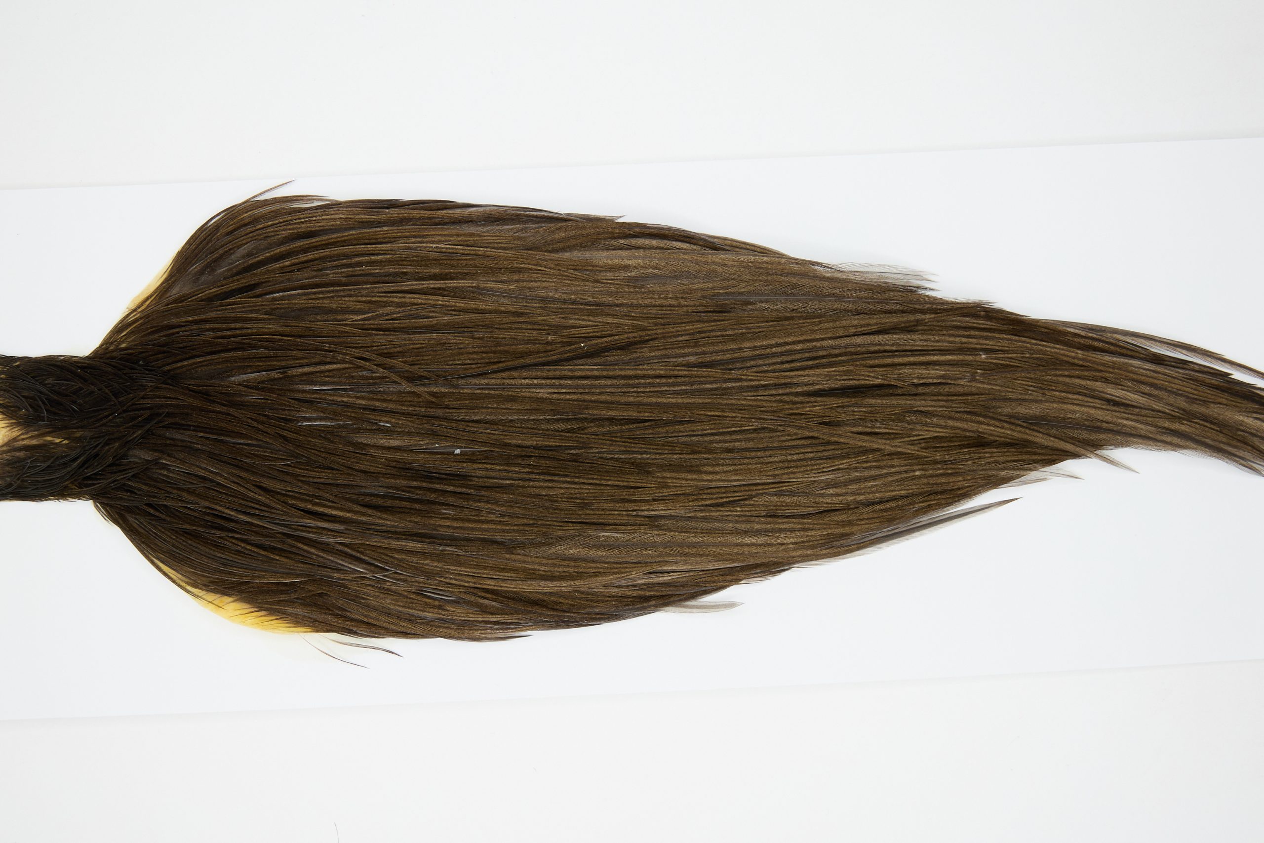 9894is a JimsFlyCo Grade 2 Rooster Cape of Brown Dun color that ties predominately size 10-18. The image shown is an actual photo of this dry fly cape. This is NEW UNUSED HACKLE.